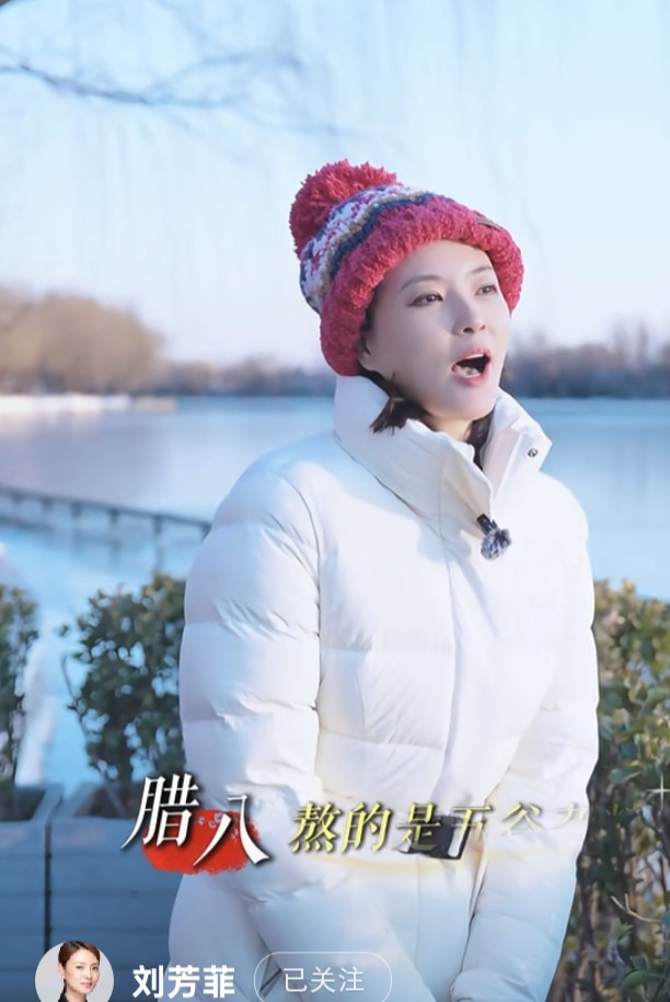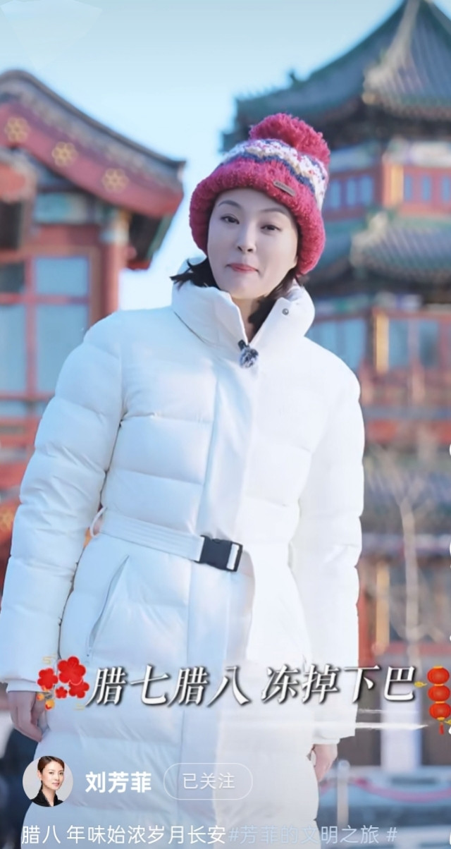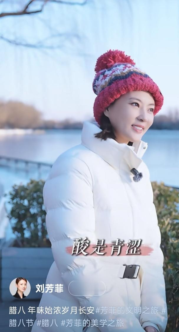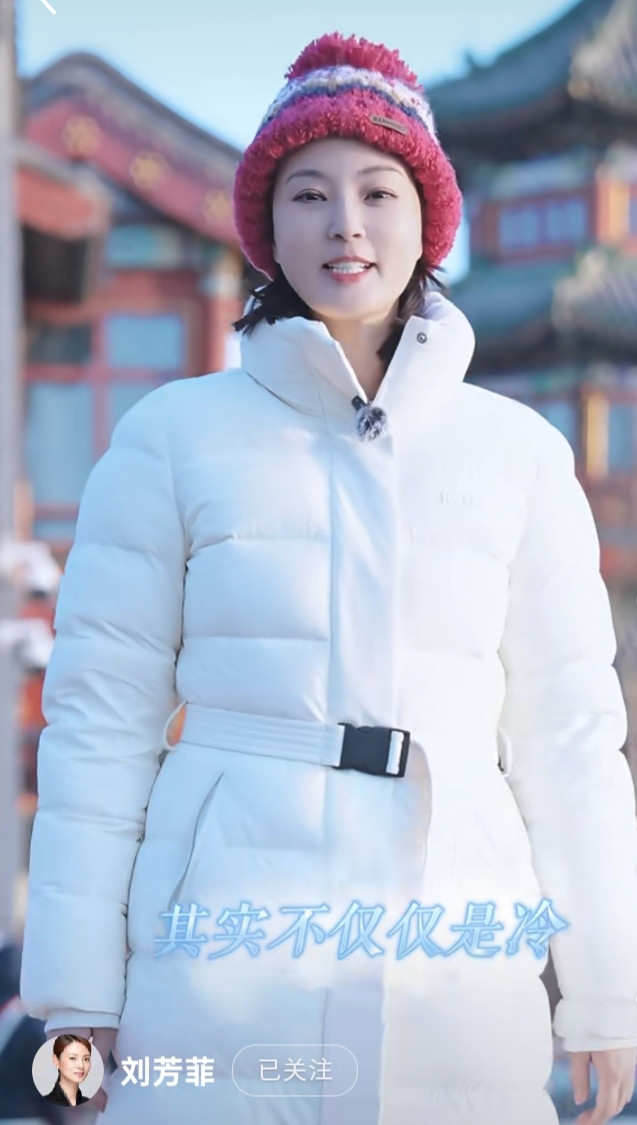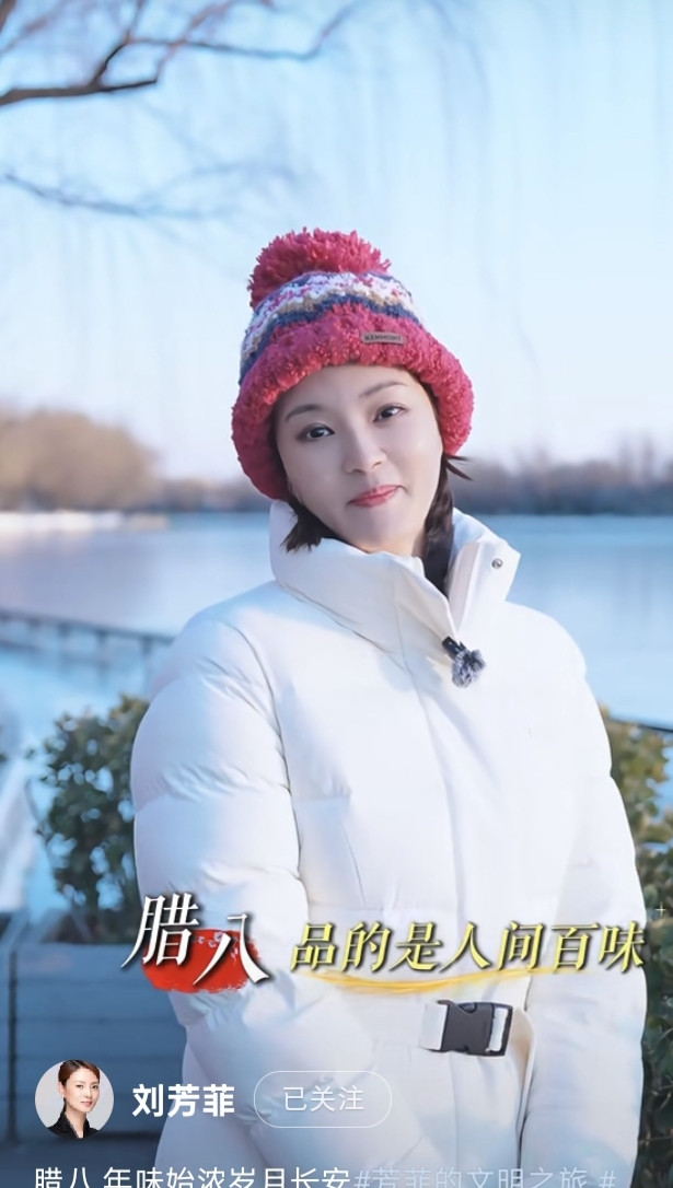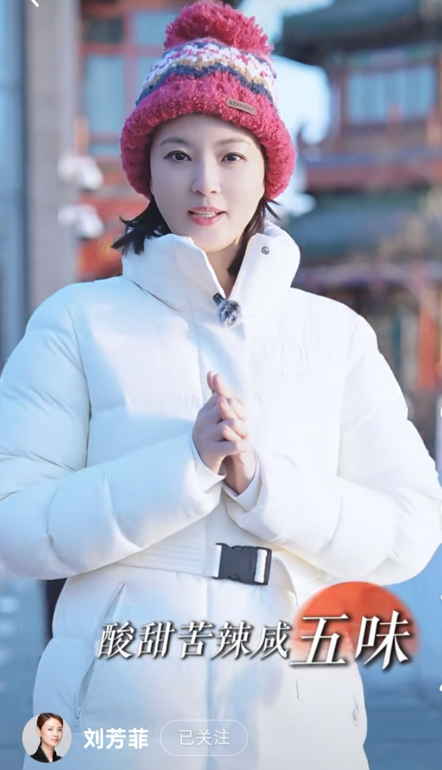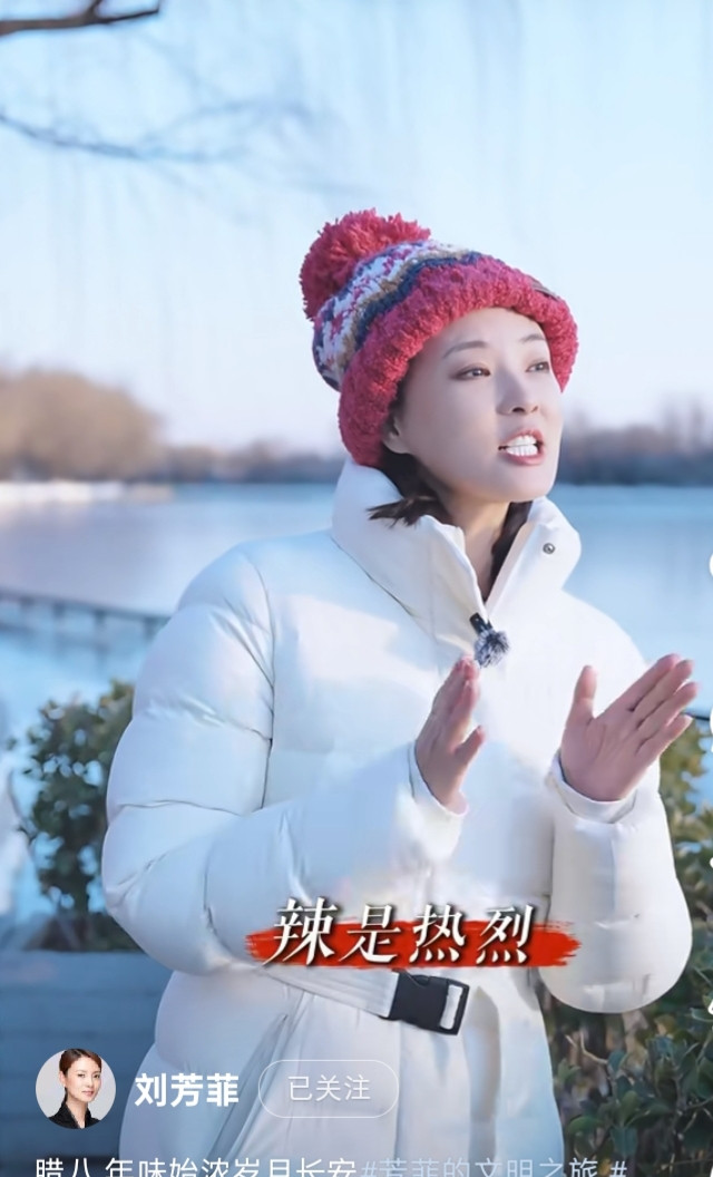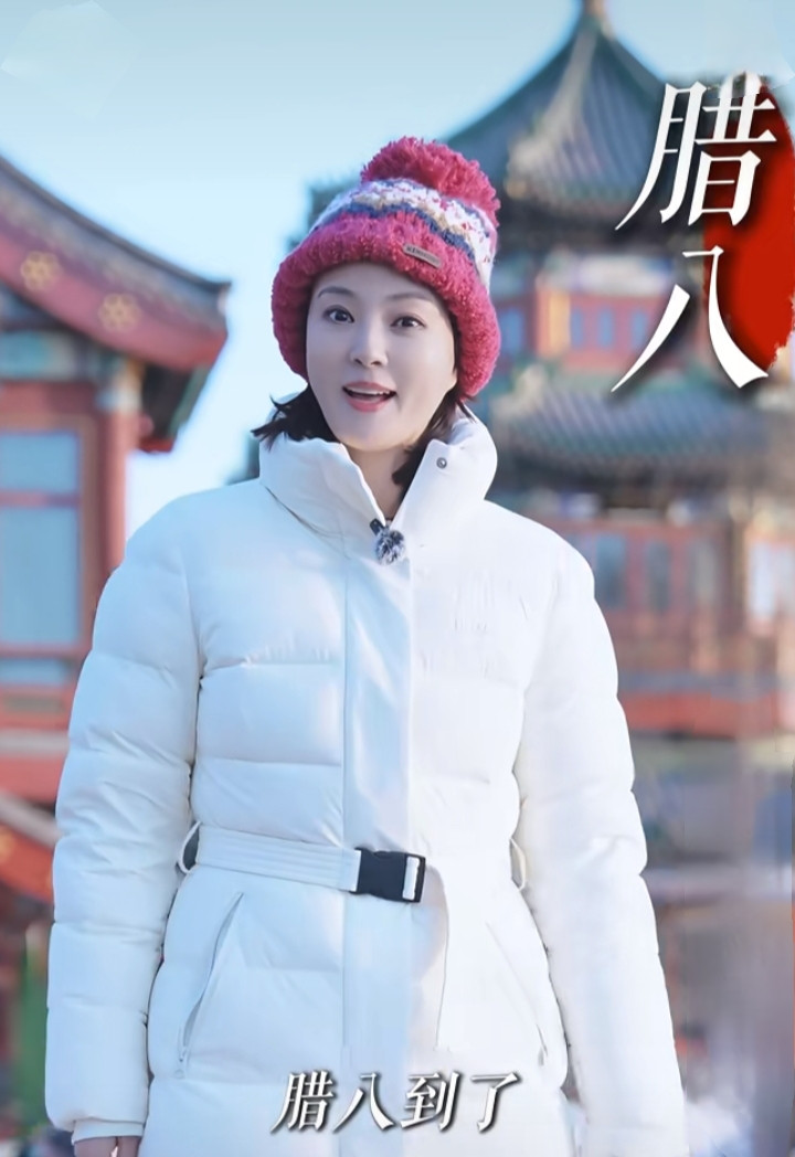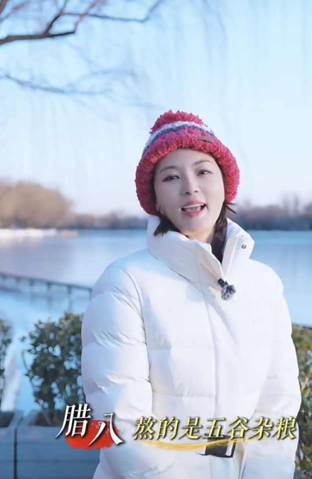 刘芳菲解读腊八, 白色羽绒服搭彩红帽, 知性优雅美得好高级